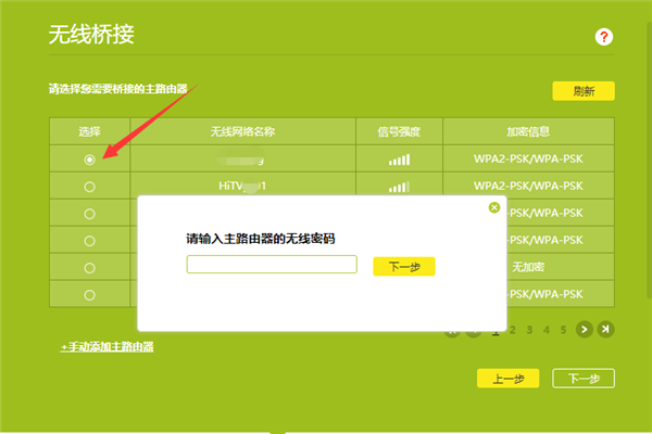 5、点“开始设置”,就开始扫描信号,接着显示附近的无线网络列表。从中找到你的主路由器,并输入无线密码。