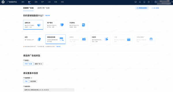 营销链路是指想通过营销活动达到曝光、互动、转化等驱动消费者行为的目标,需要在广告组层级进行确定。营销链路划分为3层——品牌认知、用户意向、行动转化。为了更加贴近客户营销活动中的理念,更准确的表达客户的营销诉求,更匹配客户的营销目标。巨量引擎广告投放平台从营销角度出发,对营销链路进行了升级,升级后将更好的满足客户营销分析、方法论沉淀、企业经营指导等多方面的诉求。