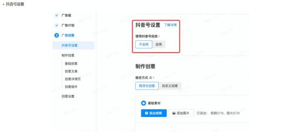 2.绑定完成后,广告主在平台新建创意时,在“抖音号设置”模块选择“使用抖音号投放”,并选择对应的抖音号。