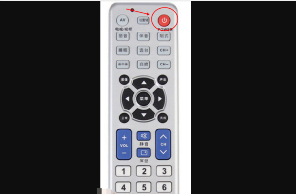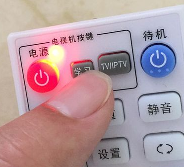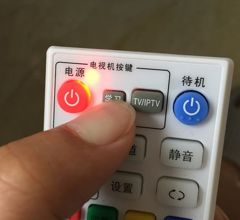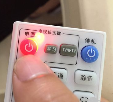 2、操作电视机遥控器。把电视机遥控器的红外线发射器对准机顶盒遥控器的发射器,(红外线发射器一般位于遥控器的最前端,形状有点像一个小灯泡,但是不会亮)红灯一直亮起之后,再按下机顶盒开关按钮,按了开关按钮之后红灯就会开始不停的闪烁