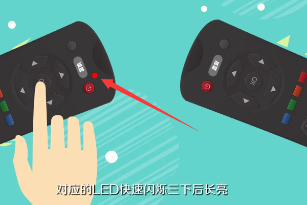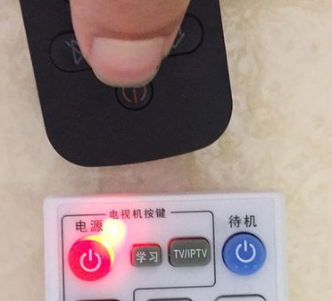 4、2个遥控器红外区域对准之后按住电视机遥控器开关按钮不放,此时机顶盒遥控器上红灯开始快速闪烁,闪几秒会停止,然后一直常亮(这个就说明已经学习成功)。