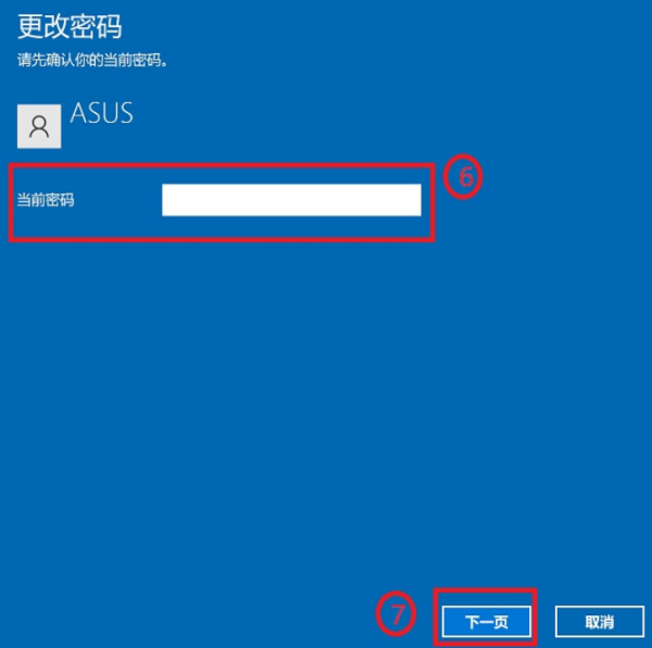 请输入您目前的密码⑥,然后点选[下一页]⑦。