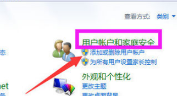 2、打开控制面板,点击“用户账户和家庭安全”。