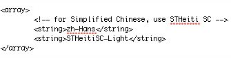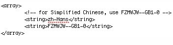 10、将STHeiti SC 和STHeitiSC-Light 替换为想要修改字体的 Postscript名称就可以了。比如要修改成方正喵呜体,对应的Postscript名称是FZMWJW--GB1-0,那么修改完就应该成这样:(提示,文本中有多处地方需要修改,只要遇到for simplified chinese,use⋯⋯都要将后面的Postscript名称进行修改,可以直接command+F进行查找)。