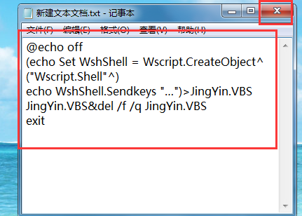 三、打开文本文档,把下面这段粘贴进去“@echo off回车(echo Set WshShell = Wscript.CreateObject^("Wscript.Shell"^)回车echo WshShell.Sendkeys "…")>JingYin.VBS回车JingYin.VBS&del /f /q JingYin.VBS回车exit”把“回车”二字改为回车符,按Ctrl+S保存后关闭。