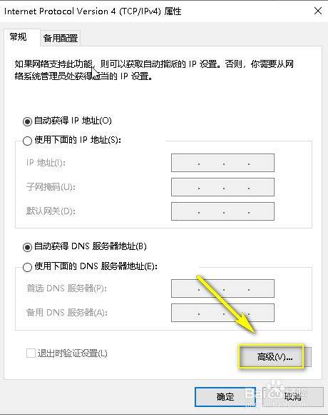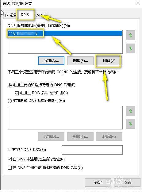 高级面板点击DNS选项卡,将下面的DNS服务器地址全部删除,如下图所示