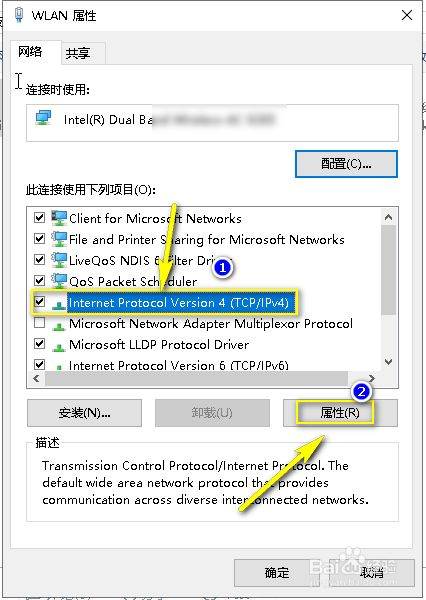 属性界面,点击选中internet协议IPV4,点击下面的属性按钮,如下图所示