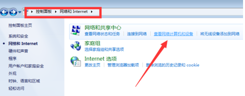 打开“控制面板”-“网络和Internet”界面,点击“查看网络计算机和设备”按钮。