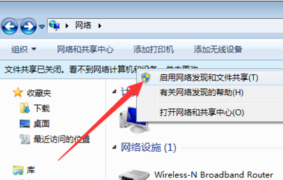 在打开的“网络”窗口中,会看到“文件共享已关闭,看不到网络计算机和设备,请单击更改”的提示点击。