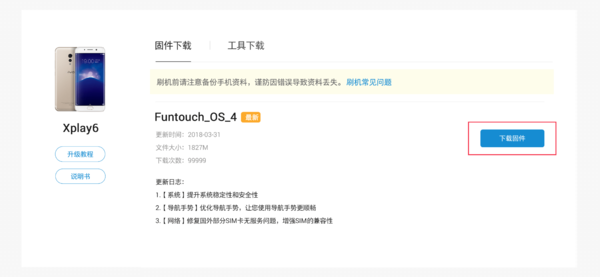1、首先进入vivo官网下载固件包:www.vivo.com.cn/upgrade/index选择对应机型,然后点击“资源下载”后在固件升级下面下载对应的固件升级包(全量包):