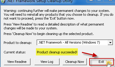 6、出现“Product cleanup succeeded!”信息后,就表示清理已经完成了。按一下“Exit”(退出)关闭窗口。最后,请重启计算机以重新安装您所需要的.NET Framework。