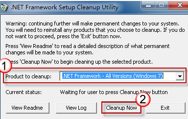5、“Product to cleanup”(清理产品)一项,请在右边下拉菜单中选择“.NET Framework - All Versions(...)“(所有版本的.NET Framework),然后单击“Cleanup Now”(立即清理)继续。