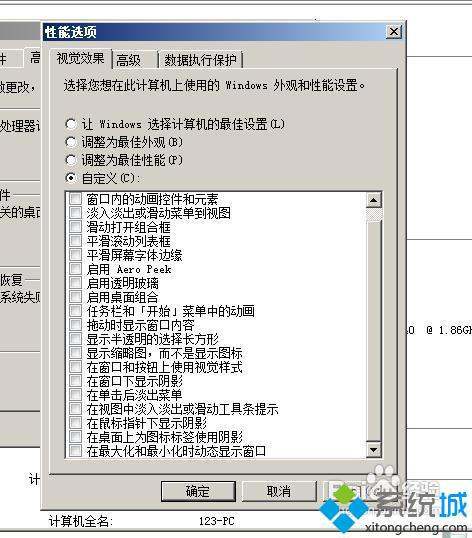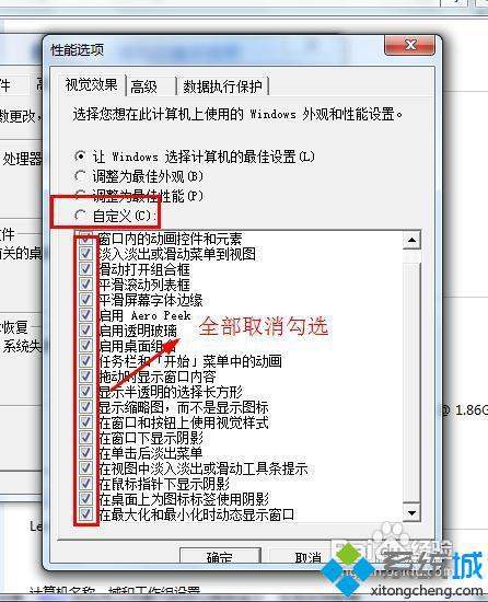3、勾选自定义,然后将所有特效全部取消。点击确定即可;