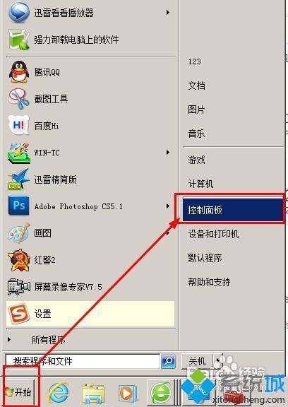 1、点击开始——控制面板;