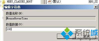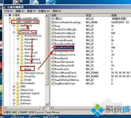 3、找到hoke_current_user>>control_panel>>mouse>>mousehovertime,双击它,设置数值为100。这样鼠标移动到任务栏的时候就会立即显示缩略内容。增加了电脑操作的流畅性;