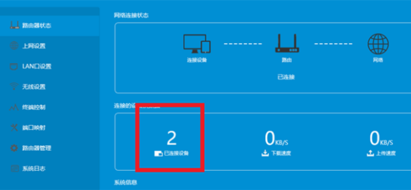 3、这时可以看到的路由器的状态,再找到【设备管理】图标,在右侧可以看到正在连接的WIFI的设备。