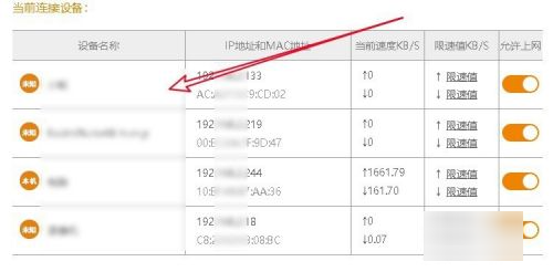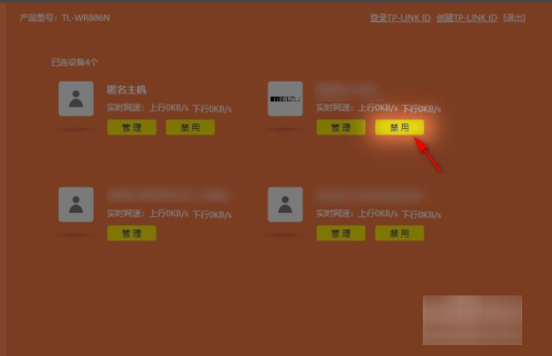5、逐一排查,如果发现了恶意蹭网设备,可以点击下面的“禁用”,如下图所示,这样这台设备就无法再蹭自家Wifi了。