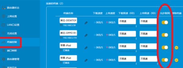 5.也可以点击终端控制进入,这里可以更加详细的观察连接的设备,连以往连接过的设备都可以查看到,若有蹭网嫌疑,可以管理是否允许联网。