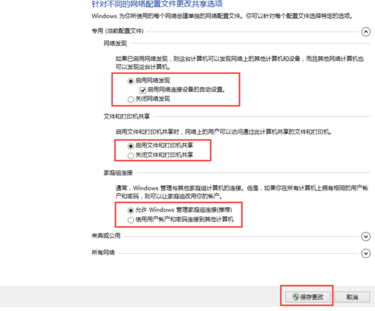 (2)点开下拉菜单,打开”启用文件和打印机共享“,启用”网络发现“;