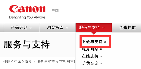 1、打开佳能官方网站http://www.canon.com.cn/,鼠标指到服务与支持上,选择下载与支持。
