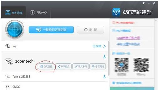 4、点击查询之后会提示你图标后面带有一把钥匙的就是可以破解的,点击自动连接(电脑)或者万能钥匙自动连接(手机)便可以连接到该网络了。
