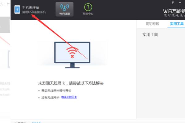1、首先打开计算机,再打开计算机内的wifi万能钥匙并进入,在wifi万能钥匙界面左上角找到“手机未连接”选项并单击。