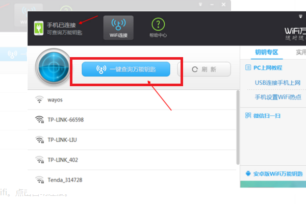 4、将计算机与手机连接成功后,在计算机的wifi万能钥匙界面内找到“一键查询万能钥匙”选项并单击。