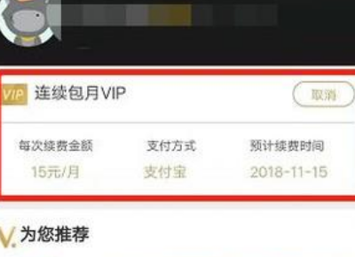 3、进入会员中心,你会看到你是连续包月VIP,以及自动续费支付方式!要取消优酷会员自动续费,所以点“连续包月VIP”右边的“取消”按钮。