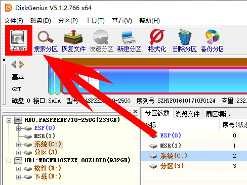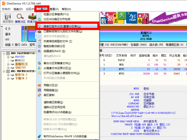 4、打开下载的DiskGenius软件,点击左上角的工具-搜索已丢失分区(重建分区表)。