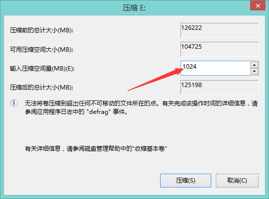 5.在弹出的界面中输入压缩空间量,一个G=1024MB,所以此处输入1024,输入完成后点击压缩。