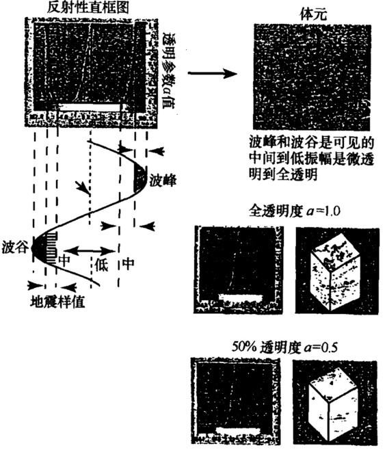 三维可视化中,地震样点被转化为三维体元,该体元同时携带着与透明度相关的可由用户定义的变量,即透明度参数 (图 8-14)。三维地震数据体可视化的基本思路就是通过调整地震数据体的透明度来直接评价三维空间中地下界面的地震反射。