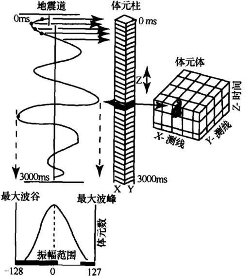 三维可视化技术是当今最先进的三维图像显示技术,具有在二维屏幕上显示三维图像和通过显示参数的选择清晰显示构造形态、断层、各种地质体、岩性、物性、含烃性分布等特点。其原因一是在二维屏幕上快速显示运动的二维图像,以实现在二维屏幕上观察三维图像;二是根据地震属性与地质属性的相关性,在设计三维可视化技术软件中,将地震记录道的采样点转化为由处理面元和采样间隔所构成的三维体元(Voxel),一个地震记录道构成一个三维体元柱,而由多个地震记录道所构成的地震数据体则转化成多个体元柱所构成的体元体,如图6-99所示。
