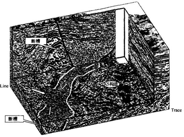 a.KS构造是中国海油在马六甲合同区的一个下第三系Brawn Snal组构造,该构造具有面积大、构造形态较好、周围有许多含油气构造和大型油田环绕等特点,因此推测它应有较好的成藏环境。但是,通过三维可视化研究发现,该构造紧临一个深的断槽,断槽中充填了近源冲积扇粗碎屑沉积,而KS构造的左翼靠断槽右翼断层封闭,由于粗碎屑岩不能封堵油气,因而分析构造的侧封风险很大。该构造面积大,诱惑力也大,因此,印尼作业者最终决定还是钻探,但其结果失败了。实践证明了我方三维可视化分析结果是正确的,见中国海油对该构造区三维地震数据体全三维地震资料解释成果中KS构造“断槽”三维可视化空间展布特征图6-102。