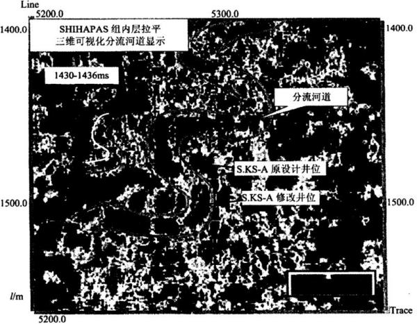 b.S.KS构造是中国海油在马六甲合同区工作时新发现的一个构造,主要目的层是上第三系SHIHAPAS组。在储层研究前,项目组根据构造形态已设计好钻探井位,后通过用全三维可视化对储层进行追踪解释及成果显示,如图6-103所示,发现SHIHAPAS组内的分流曲流河道及其伴生的决口扇等河流沉积相,图中棕红色为低振幅地震相,标定河流砂岩沉积相,依据这一三维可视化的解释成果,将原设计在河道边部高振幅页岩相带的井位移到河道主体低振幅砂岩相带部位。