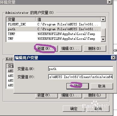 点击新建按钮,变量名path,变量值C:\Program Files\ANSYS Inc\v161\fluent\ntbin\win6。点击确定按钮即可新建path变量。