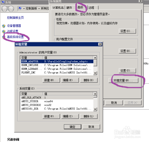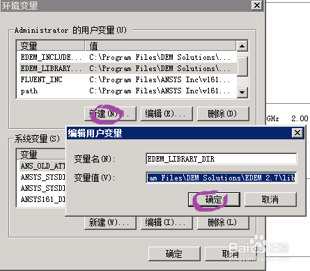 设置EDEM环境变量:点击新建按钮,变量名EDEM_LIBRARY_DIR,变量值C:\Program Files\DEM Solutions\EDEM 2.7\lib。点击确定按钮即可新建EDEM_LIBRARY_DIR变量。