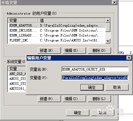 点击新建按钮,变量名EDEM_ADAPTOR_OBJECT_DIR,变量值D:\ParallelCoupling\edem_adaptor\win64。点击确定按钮即可新建EDEM_ADAPTOR_OBJECT_DIR变量。