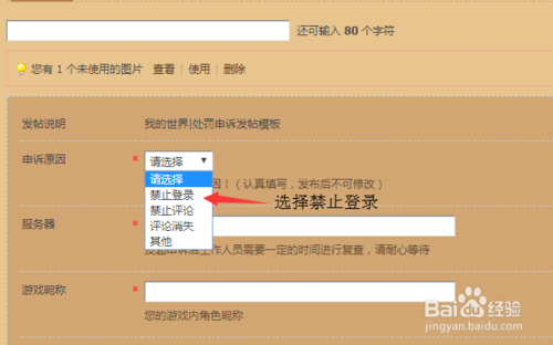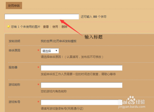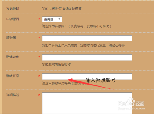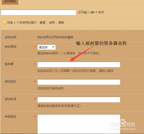 9、在最后的条框中输入事情描述,例如:和朋友玩起床战争,莫名其妙的就被封禁了,