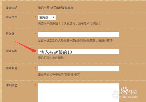 7、在箭头所指方向输入被封禁的游戏昵称,