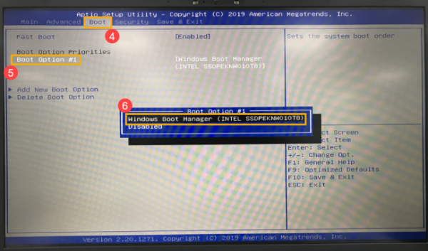 c. 确认开机硬盘是否正确。进入[Boot]页面(4),选择[Boot Option #1](5)并确认是否正确[选择您笔记本电脑的操作系统所使用的硬盘](6)。
