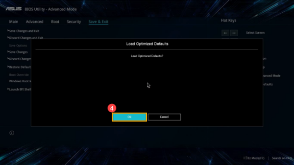 b. 进行BIOS设定还原。进入[Save & Exit]页面(2), 选择[Restore Defaults](3)后并选择[Ok](4)。