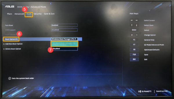 c. 确认开机硬盘是否正确。进入[Boot]页面(5),选择[Boot Option #1](6)并确认是否正确[选择您笔记本电脑的操作系统所使用的硬盘](7)。