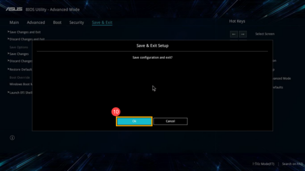 d.储存设定并离开。进入[Save & Exit]页面(8),选择[Save Changes and Exit](9)后并选择[Ok](10)。