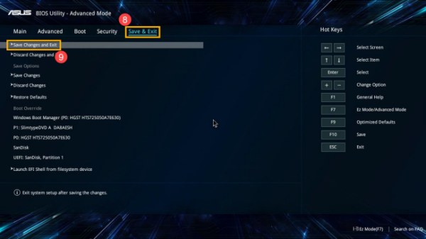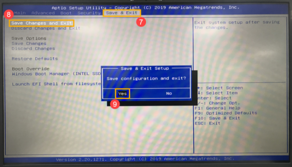 d.储存设定并离开。进入[Save & Exit]页面(7),选择[Save Changes and Exit](8)后并选择[Yes](9)。