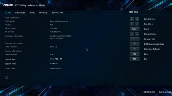 进入BIOS设定画面。请先将笔记本电脑关机,若您的笔记本电脑已卡在logo画面中,请长按电源键15秒至电源灯熄灭,静置数秒后先按住[F2]键不放,然后按下电源键开机,直到BIOS设定画面出现后即可放开[F2]键。