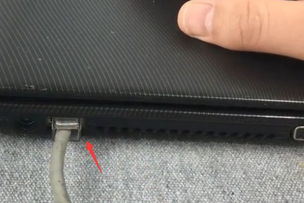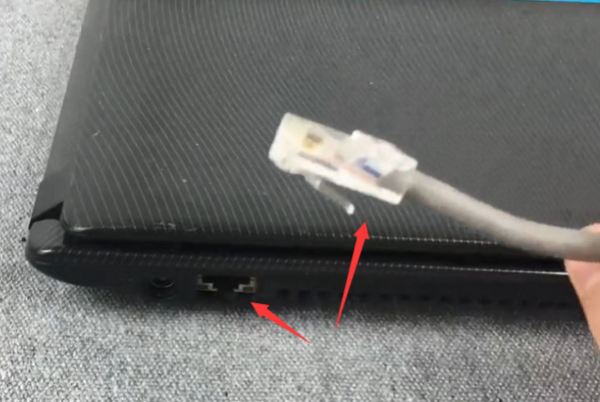 8、如是通过有线连接,则将可以上网的网线查到的该笔记本电脑的对应网口(注意水晶头的卡槽以及笔记本网口卡槽)。