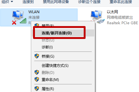 4、然后在新弹出来的页面中鼠标右键单击要连接的网络并点击选择“连接/断开”选项。