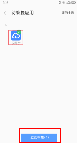 5、在接下来的界面中可以看到删除的应用,勾选后,点击下方的“立即恢复”即可恢复应用。如图所示。