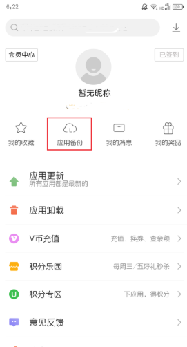 3、进入“我的”界面后,找到“应用备份”功能,点击进入,如图所示。