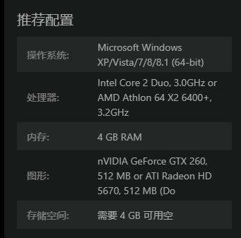根据图片上的配置要求可知,游戏推荐的配置要求比较低,处理器只要AMD Athlon 64 X2 6400+, 3.2GHz,而内存是4 GB RAM,显卡则是ATI Radeon HD 5670, 512 MB即可。